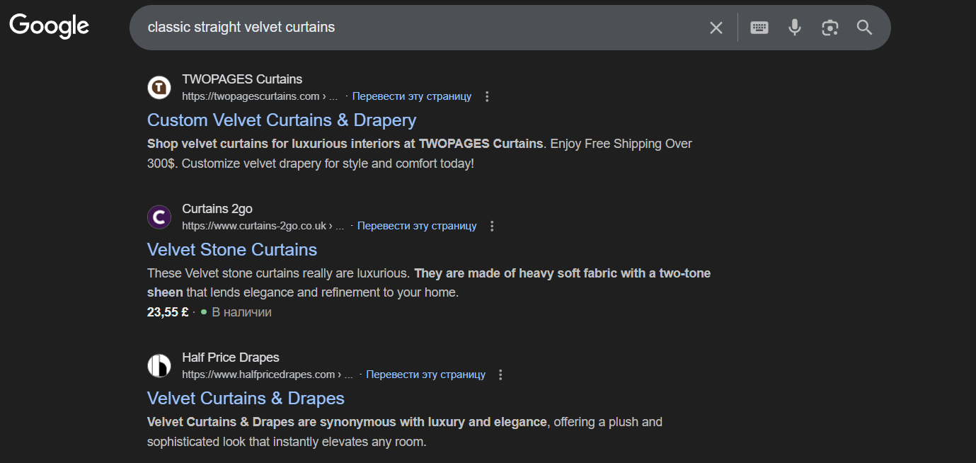 For instance, if you run a small online curtain store, winning over giant marketplaces for popular queries like "buy curtains" is nearly impossible. But for specific niche queries (e.g., "classic straight velvet curtains"), it is quite realistic to reach the top positions in search results.