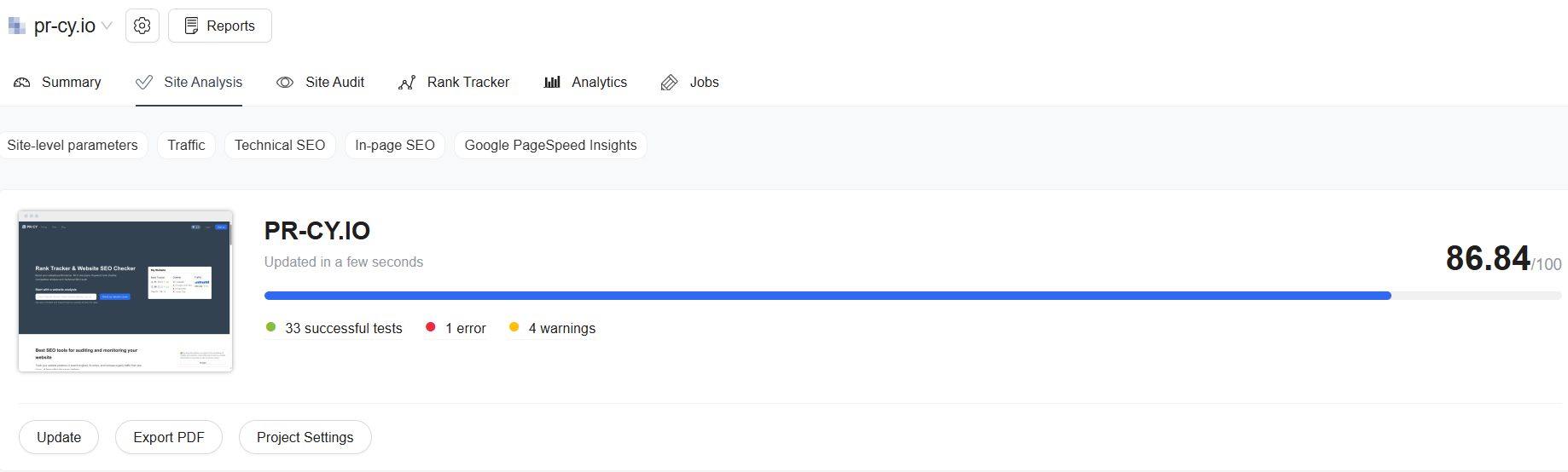 - It checks the technical and SEO parameters of the site, identifies errors, and provides recommendations on how to fix them.