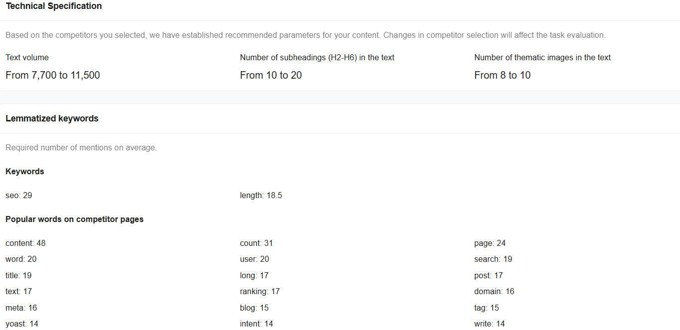 You can gather competitors’ articles manually or use services — for example, a SEO content brief generator. It parses search results based on conditions, collects relevant pages, and analyzes the texts on them: counts occurrences of specified words, the number of headings and images, and text uniqueness. Based on the collected data, a brief for writing the article is generated.