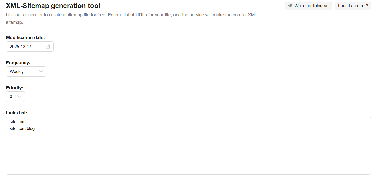 For convenient work with the sitemap, you can use an XML-Sitemap generation tool. Add the necessary links and specify the last update date, desired crawl frequency, and priority. In the result window, you can check the ready sitemap, make changes, and copy the generated text into your XML file.
