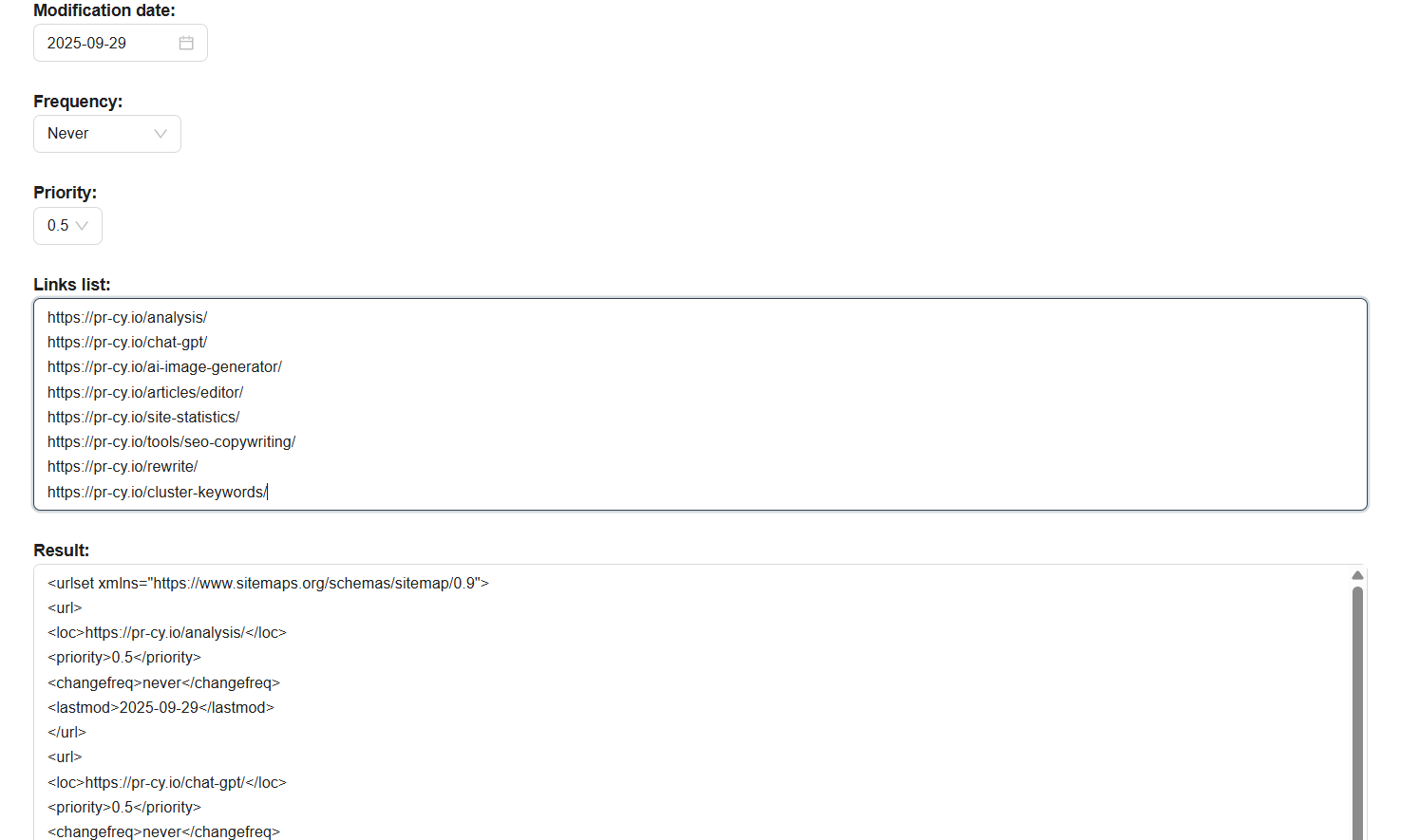XML Sitemap Generator tool Interface