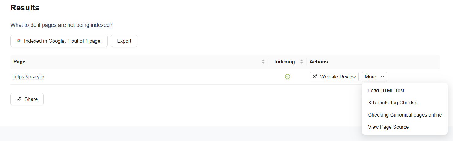 You can check the indexing status in Google using an online tool. Enter the list of URLs into the field, select the search engine, and start the check: the tool will assess the status of the pages and mark the indexed ones with a checkmark.