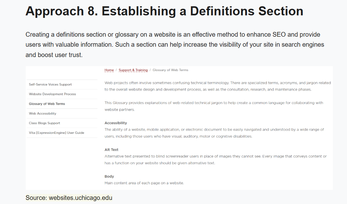 Each section should be self-contained, with clear subheadings and a logical HTML structure. For better content organization, create thematic groups (a main page with an overview + subpages with a deeper dive into the topic) and connect them with internal links.