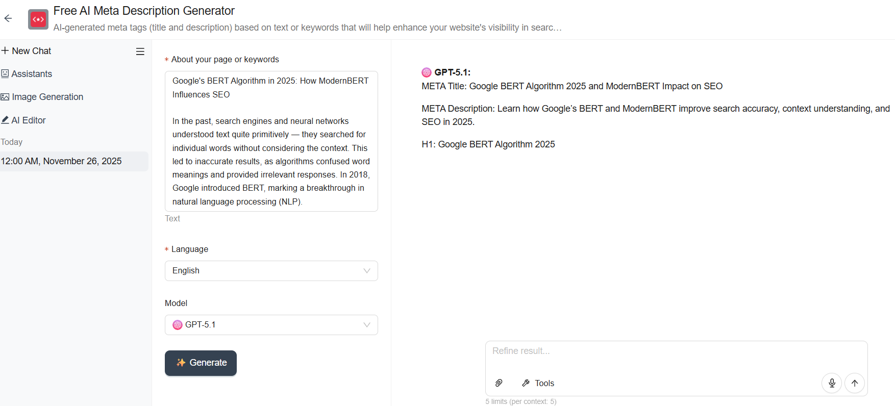 AI Meta Description Generator can help you create titles and descriptions for your page using artificial intelligence.
